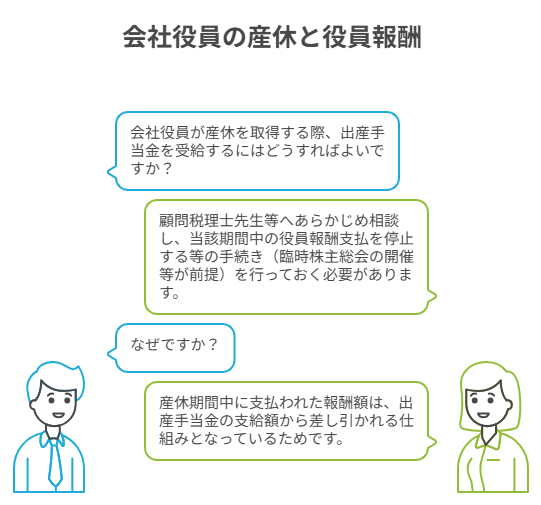 このため、会社役員の方が産休を取得するにあたり、出産手当金を受給したいのであれば、顧問税理士先生等へあらかじめ相談し、当該期間中の役員報酬支払を停止する等の手続き(臨時株主総会の開催等が前提)を行っておく必要があります。