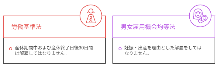 ・産休期間中および産休終了日後30日間は解雇してはなりません(労働基準法)