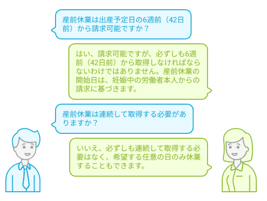 産休:連続休業の義務はなく、分割回数に制限なし(ただし産後期間は原則就労不可*)