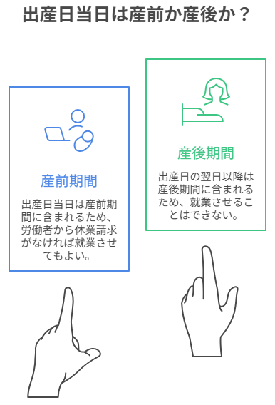 産前休業は『請求』しないと取得できませんが、産後休業は法律で『就業禁止』と定められています。